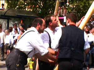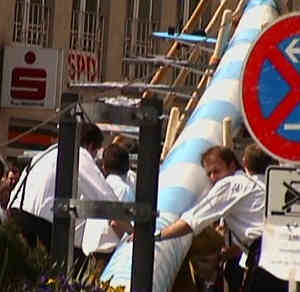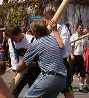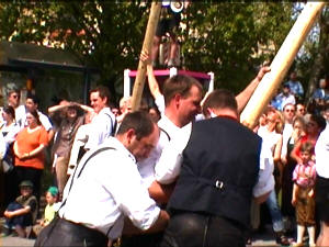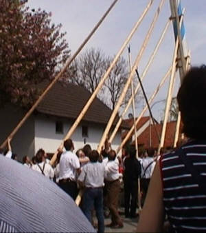 Hier sieht man vier "Schwalben" am Maibaum. So bezeichnet man diese Hölzernen Stangen, die zum Aufstellen benötigt werden. |